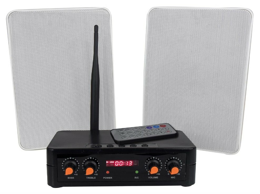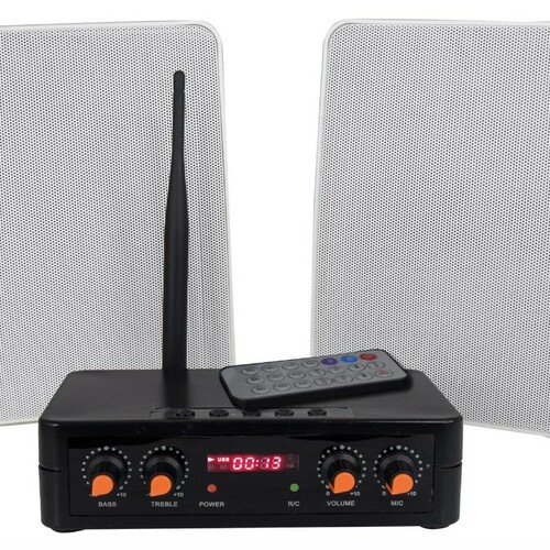 E' composto da 2 diffusori amplificati con regolazione di volume indipendente e da una centralina trasmittente con funzione radio, Mp3, bluetooth e presa microfonica. Basta collegare i diffusori ad una comune presa elettrica per ricevere il segnale dalla trasmittente in un raggio di 20mt.I diffusori sono completamente impermeabili e adatti anche al posizionamento all'aperto. Possono essere appesi a parete sia direttamente sia tramite una staffa regolabile in dotazione. La loro potenza massima è di ben 50W l'uno. La trasmittente permette di regolare il volume di tutti i diffusori (anche eventuali acquistati successivamente) gestendo separatamente il volume del microfono e i toni alti e bassi. Possiede i classici tasti per la riproduzione di brani Mp3 letti da chiavette USB con funzione di ripetizione automatica. Non manca neppure una presa per segnale esterno. Un pratico telecomando completa il kit. Adatto per l'installazione in ristoranti, pub, piscine, giardini ... ovunque. Un sistema pratico ed espandibile.